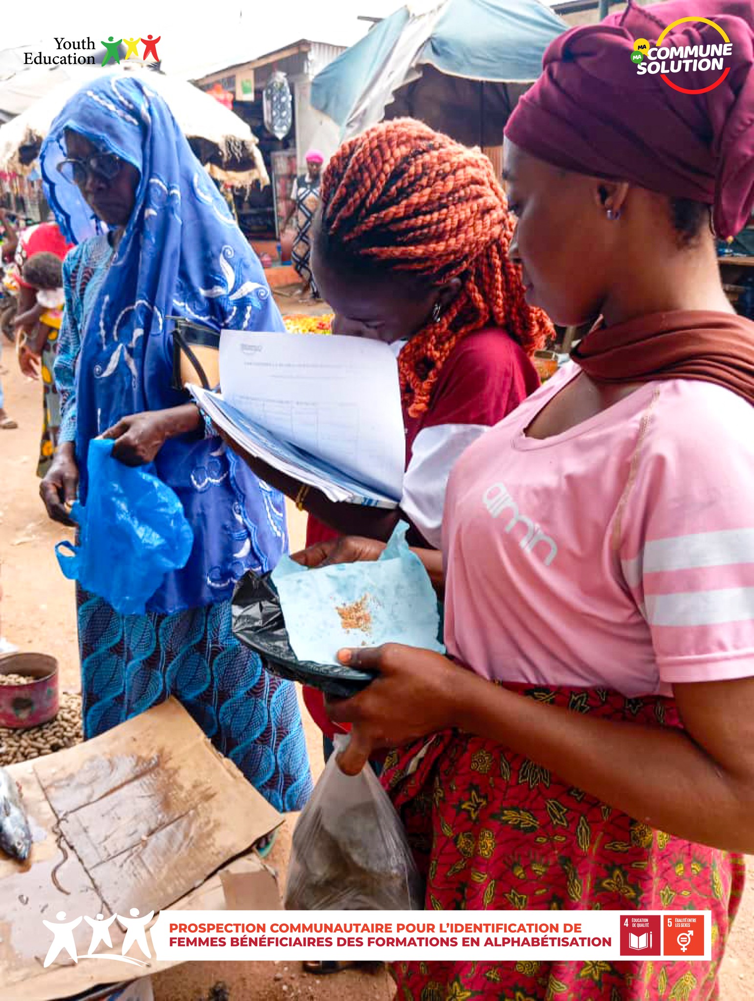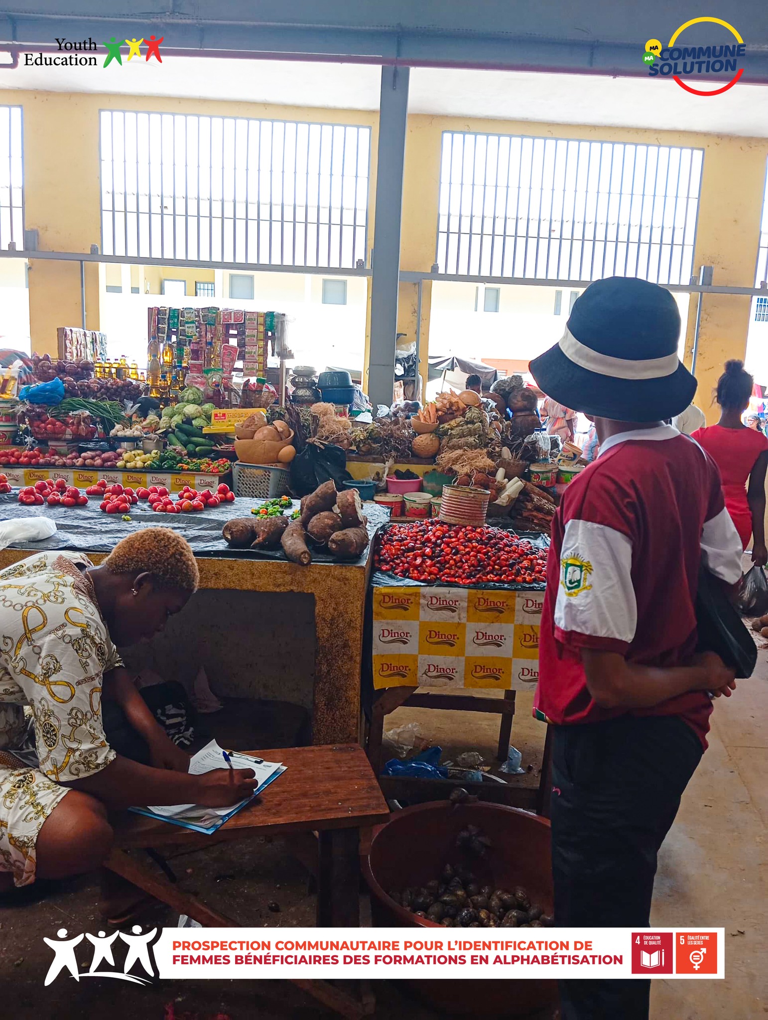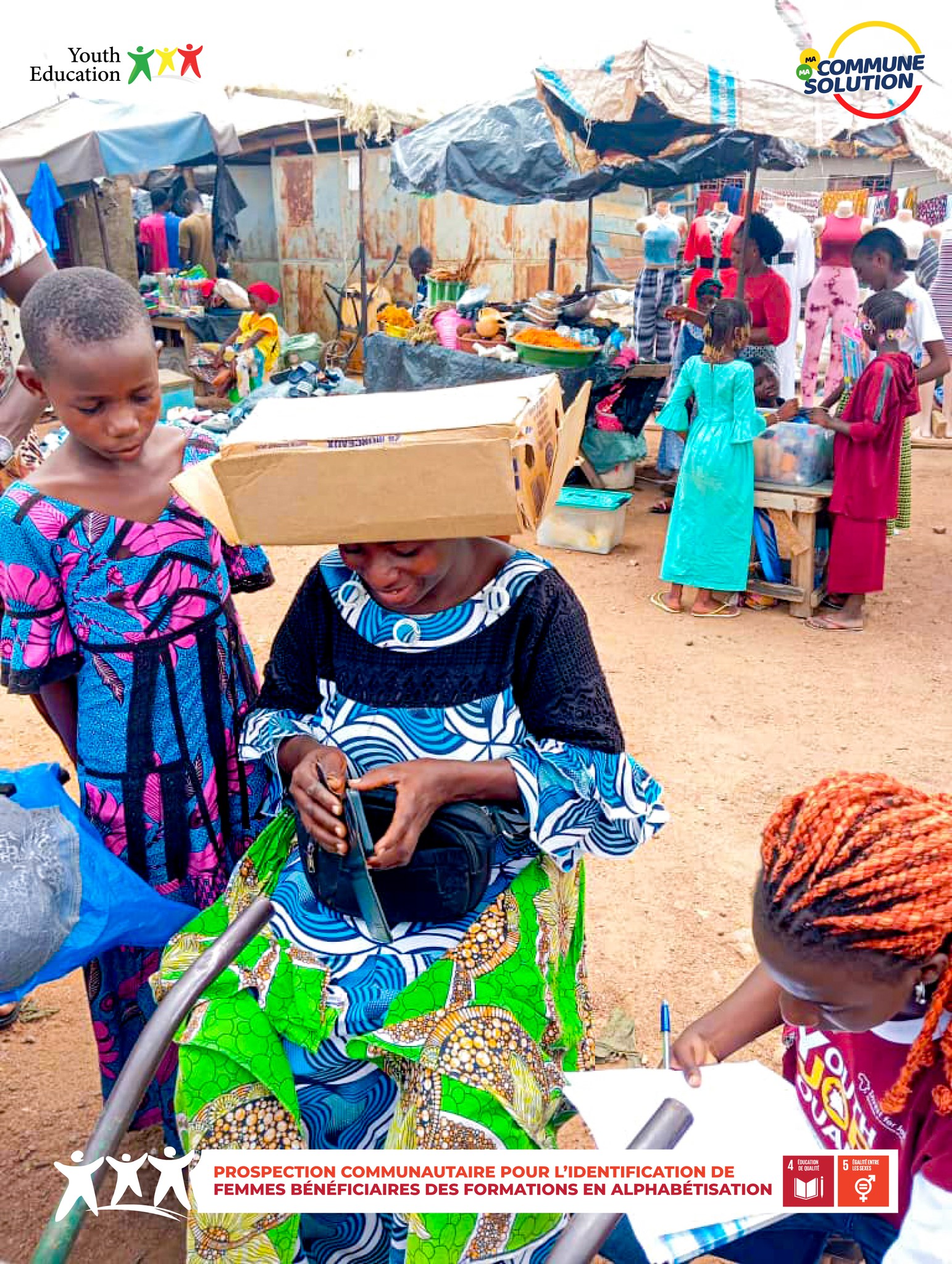 As part of the My Community, My Solution program, the Bouaké West, Zone 2 team mobilized for a prospecting mission in the Broukro and Ahougnanssou markets, as part of the “Literacy for the Empowerment of Girls and Women” project.