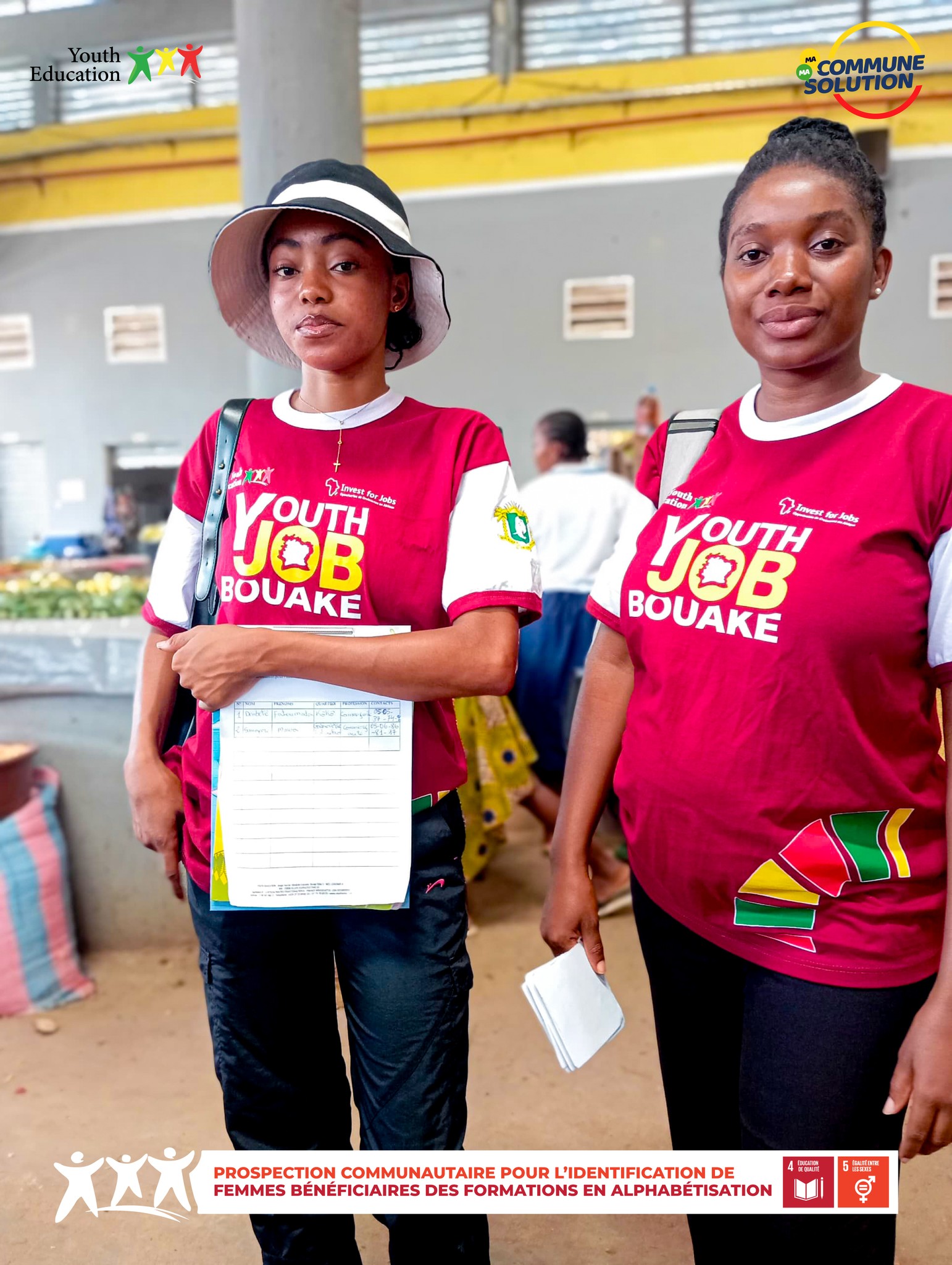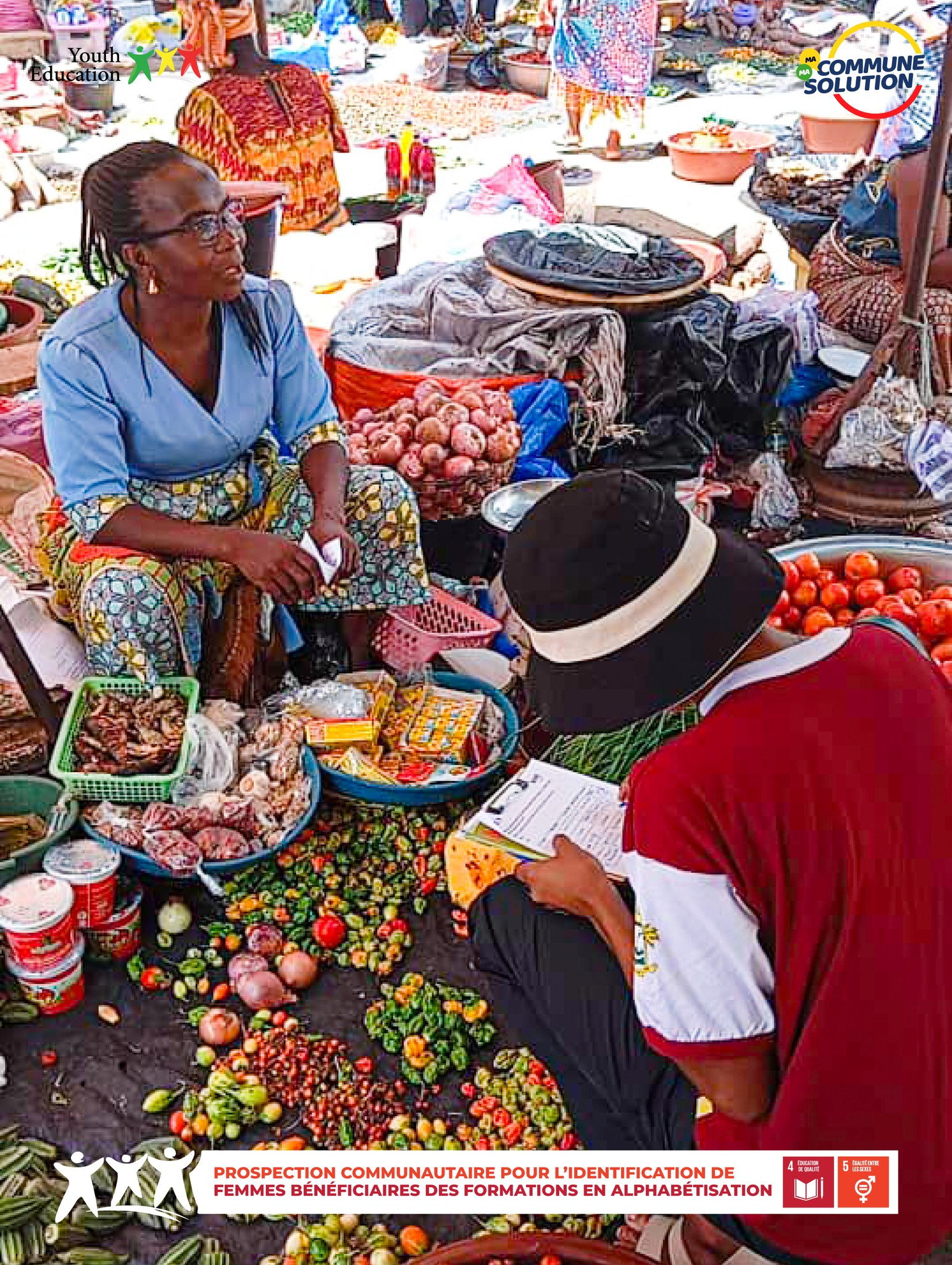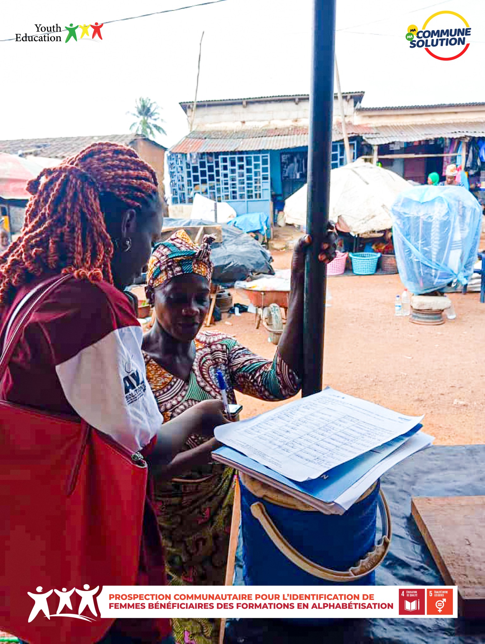 As part of the My Community, My Solution program, the Bouaké West, Zone 2 team mobilized for a prospecting mission in the Broukro and Ahougnanssou markets, as part of the “Literacy for the Empowerment of Girls and Women” project.
