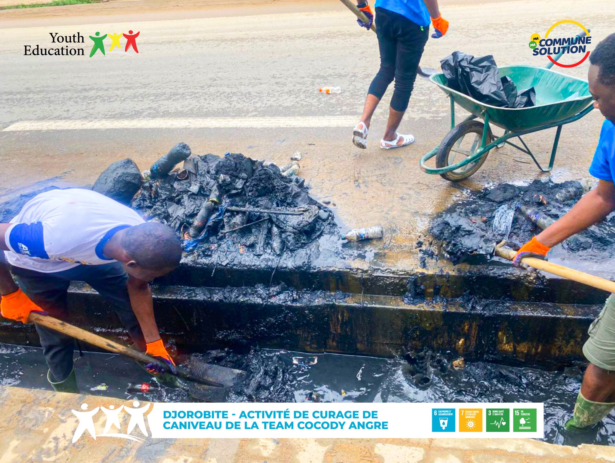 As part of the #MaCommuneMaSolution project, the Cocody Angré team carried out a drainage canal cleaning activity in Djorobité, promoting cleanliness and the well-being of the community.