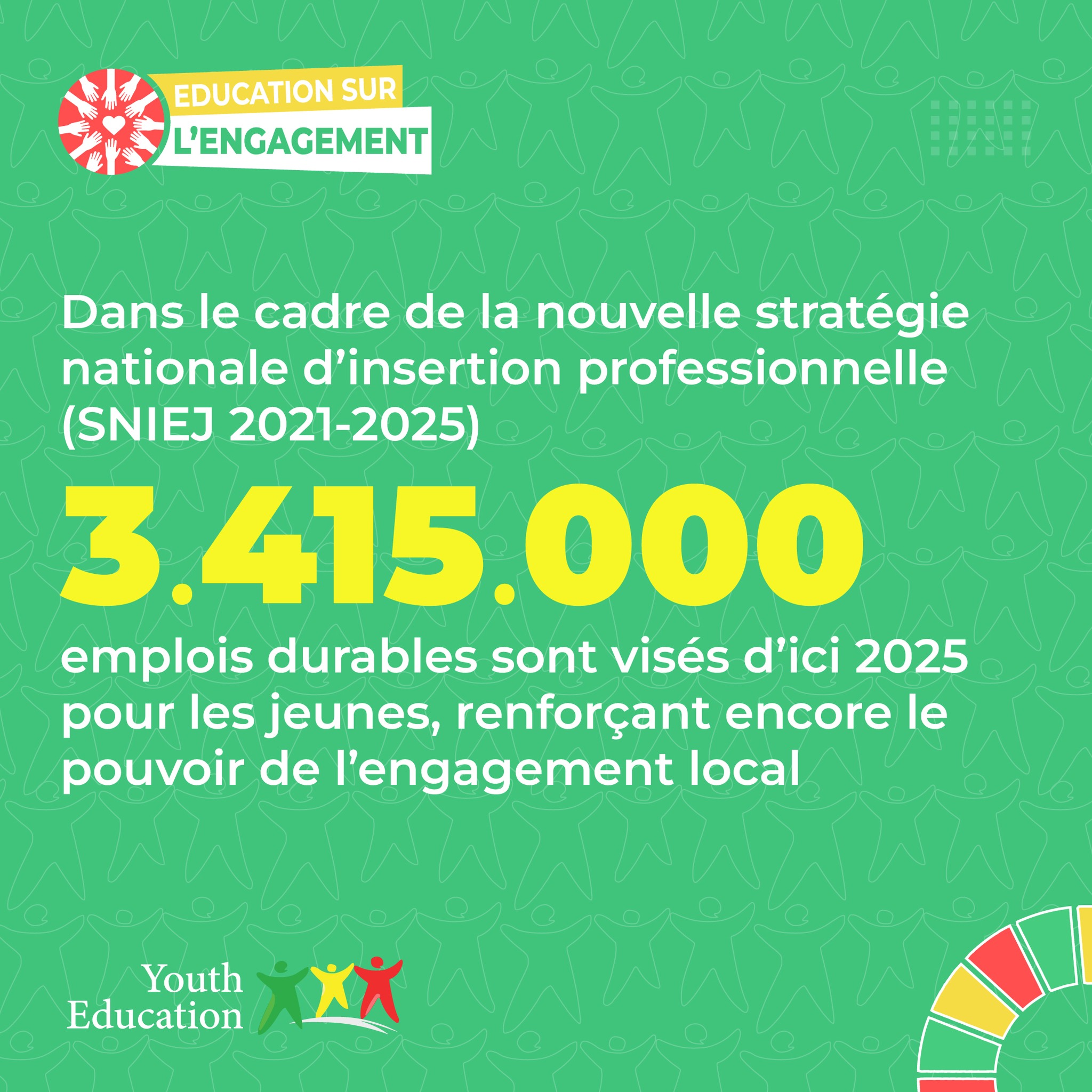 Selon un rapport de Mémoire Online portant sur la contribution des ONG et programmes de formation, 𝗽𝗹𝘂𝘀 𝗱𝗲 𝟮 𝗺𝗶𝗹𝗹𝗶𝗼𝗻𝘀 𝗱’𝗲𝗺𝗽𝗹𝗼𝗶𝘀 𝗼𝗻𝘁 𝗲́𝘁𝗲́ 𝗰𝗿𝗲́𝗲́𝘀 𝗲𝗻𝘁𝗿𝗲 𝟮𝟬𝟭𝟭 𝗲𝘁 𝟮𝟬𝟭𝟵 𝗴𝗿𝗮̂𝗰𝗲 𝗮̀ 𝗱𝗲𝘀 𝗶𝗻𝗶𝘁𝗶𝗮𝘁𝗶𝘃𝗲𝘀 𝗽𝘂𝗯𝗹𝗶𝗾𝘂𝗲𝘀 liées à l’engagement local et communautaire. De plus, dans le cadre de la nouvelle stratégie nationale d’insertion professionnelle (SNIEJ 2021‑2025), 𝟯 𝟰𝟭𝟱 𝟬𝟬𝟬 𝗲𝗺𝗽𝗹𝗼𝗶𝘀 𝗱𝘂𝗿𝗮𝗯𝗹𝗲𝘀 𝘀𝗼𝗻𝘁 𝘃𝗶𝘀𝗲́𝘀 𝗱’𝗶𝗰𝗶 𝟮𝟬𝟮𝟱 𝗽𝗼𝘂𝗿 𝗹𝗲𝘀 𝗷𝗲𝘂𝗻𝗲𝘀, 𝗿𝗲𝗻𝗳𝗼𝗿𝗰̧𝗮𝗻𝘁 𝗲𝗻𝗰𝗼𝗿𝗲 𝗹𝗲 𝗽𝗼𝘂𝘃𝗼𝗶𝗿 𝗱𝗲 𝗹’𝗲𝗻𝗴𝗮𝗴𝗲𝗺𝗲𝗻𝘁 𝗰𝗼𝗺𝗺𝘂𝗻𝗮𝘂𝘁𝗮𝗶𝗿𝗲.