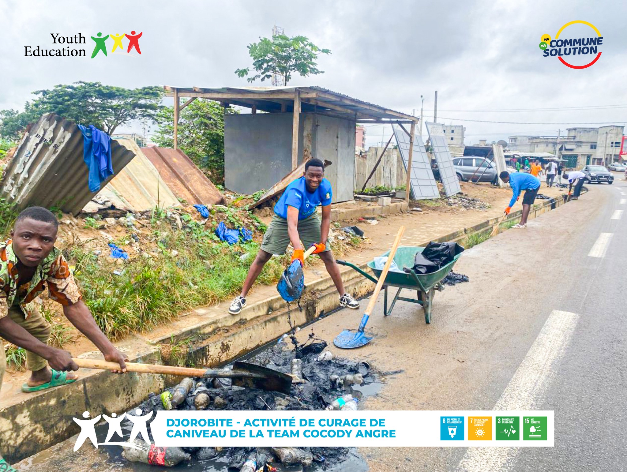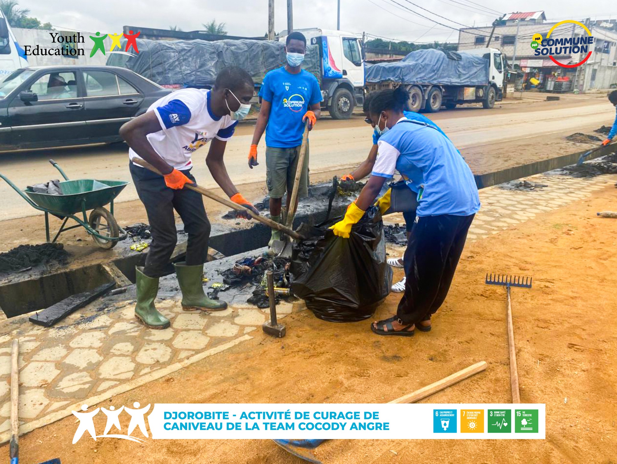 As part of the #MaCommuneMaSolution project, the Cocody Angré team carried out a drainage canal cleaning activity in Djorobité, promoting cleanliness and the well-being of the community.