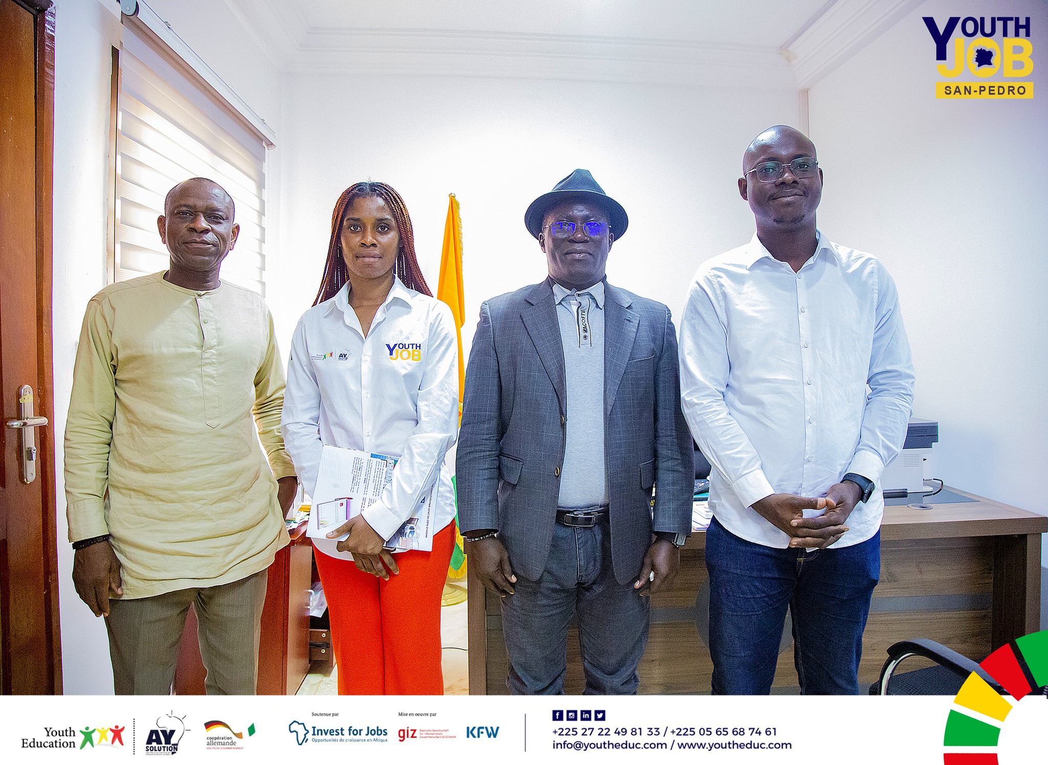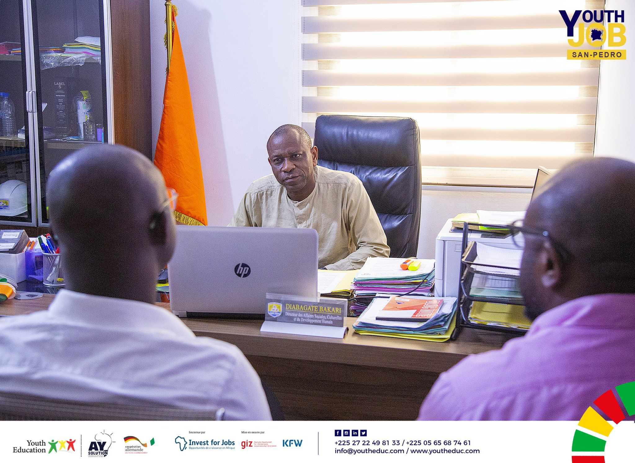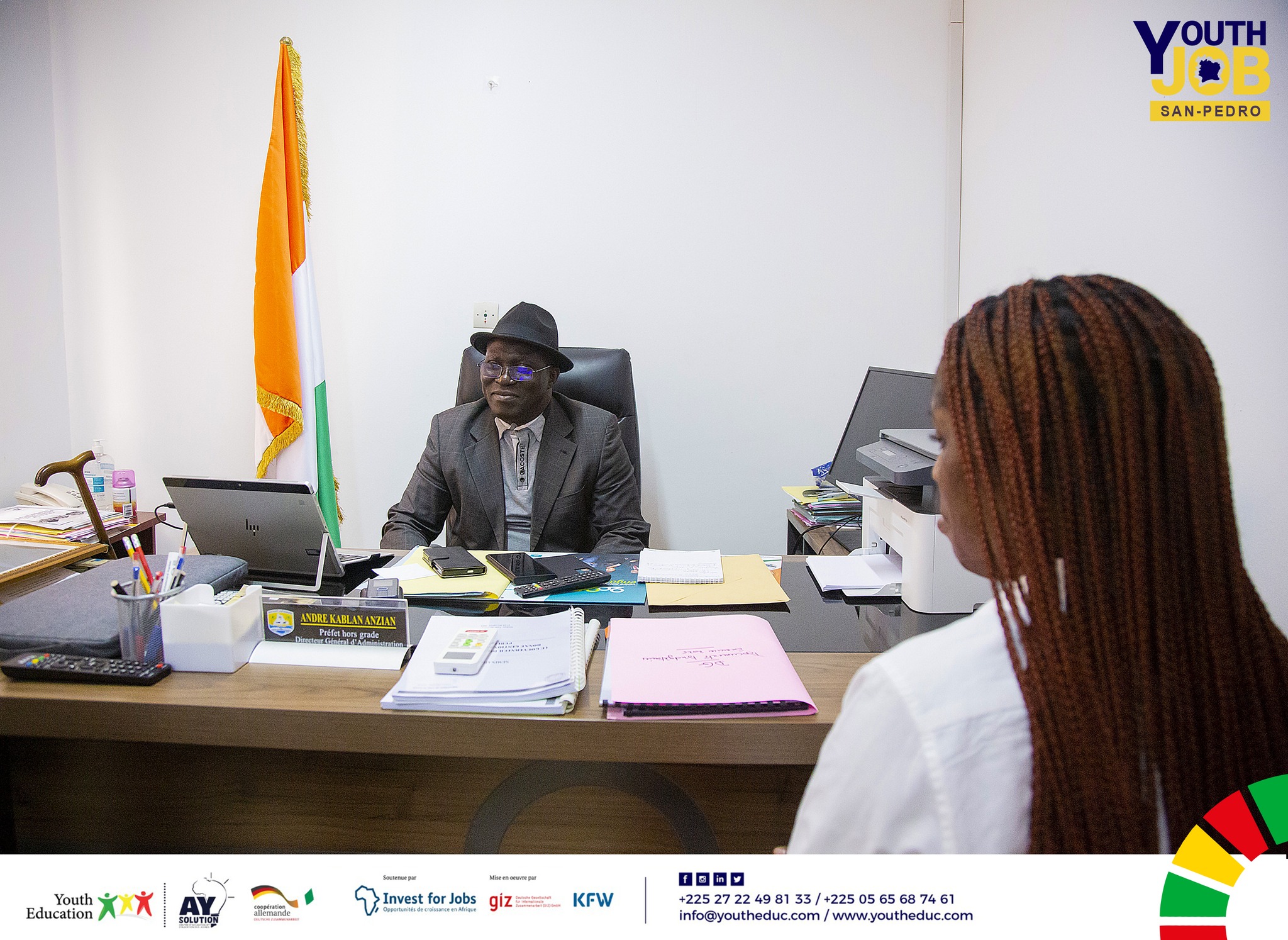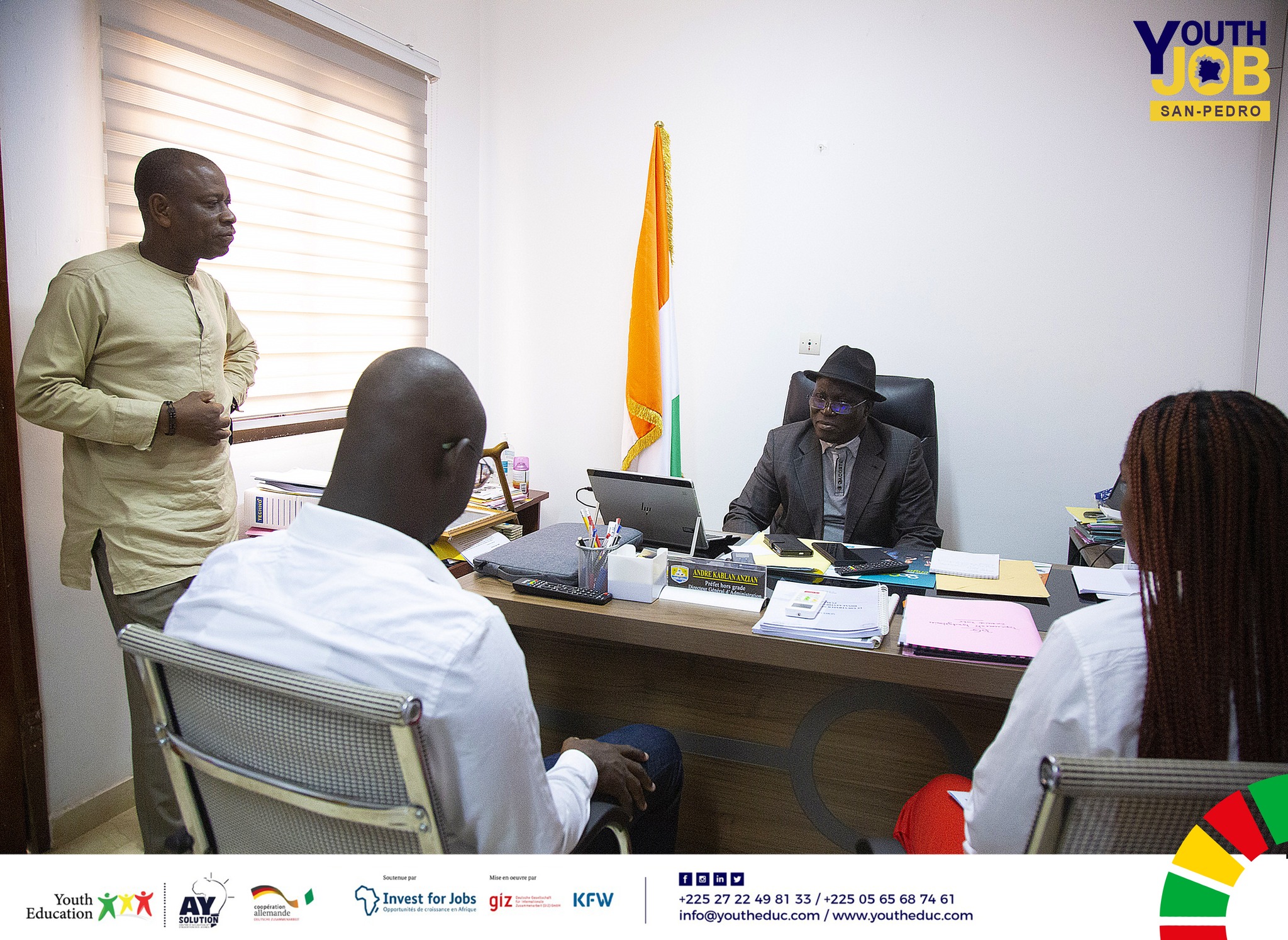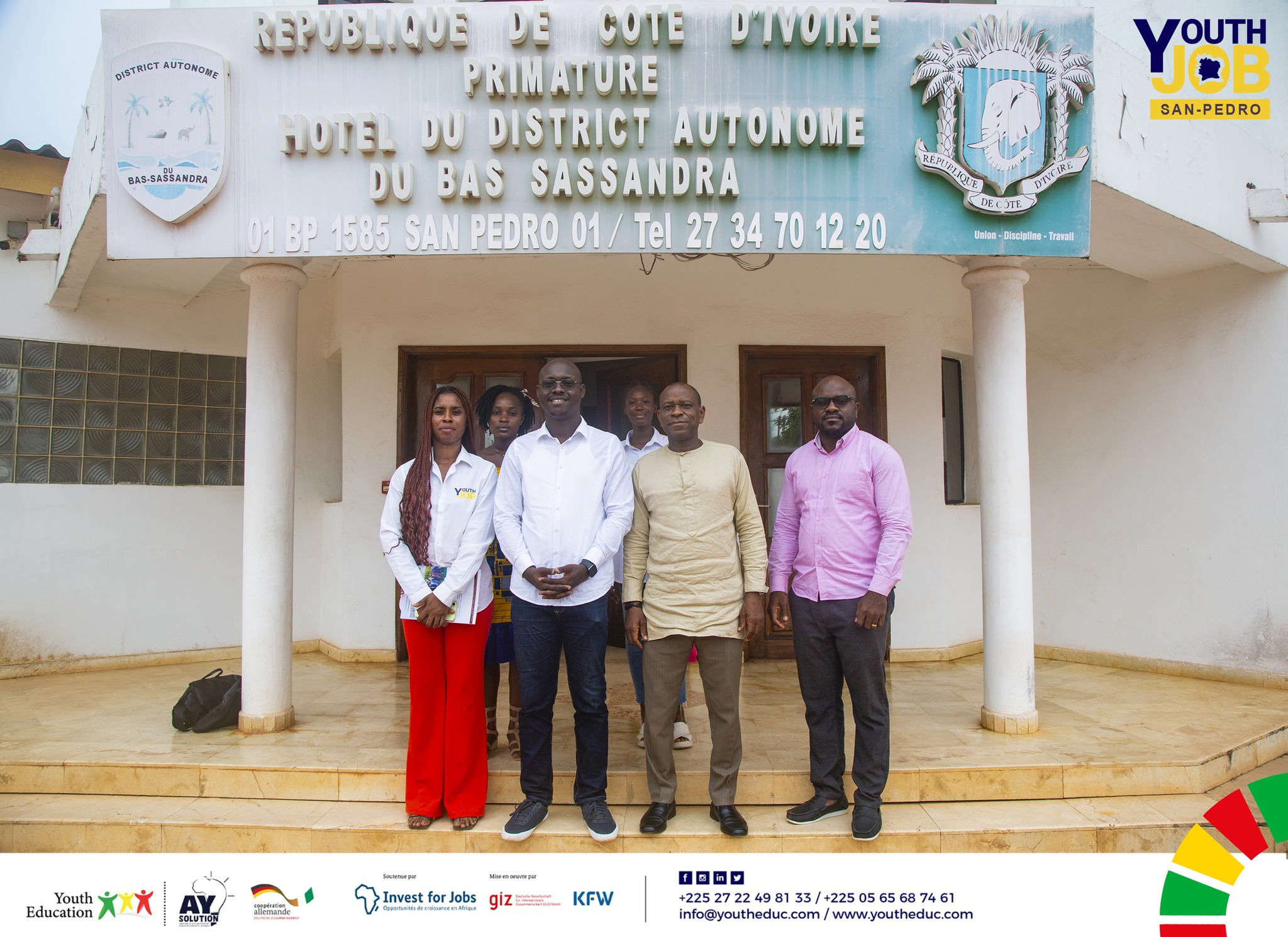 L'รฉquipe de Youth Education a รฉtรฉ reรงue en audience ร l'Hรดtel du District Autonome de Bas-Sassandra, par M. Andrรฉ Kablan Anzian, Prรฉfet Hors Grade et Directeur Gรฉnรฉral de l'Administration, ainsi que par M. Diabagatรฉ Bakary, Directeur des Affaires Sociales, Culturelles et du Dรฉveloppement Humain.